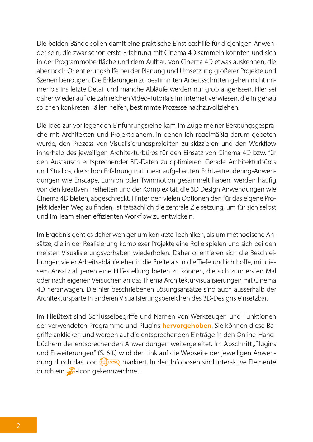 Die Reihe „Professionelle Architekturvisualisierungen mit Cinema 4D“ führt den Leser über zwei Bände von der Projektidee und Planung über die Modellierung der Szenenelemente, der Einrichtung der Materialien, Beleuchtung und Render-Settings bis zum Rendering und den abschließenden Postproduction-Schritten durch die vielfältigen Abläufe eines Visualisierungsvorhabens. Alle Prozesse, Techniken und Methoden werden für Einsteiger nachvollziehbar beschrieben und illustriert, sodass der Leser einen umfassenden Überblick über die notwendigen Schritte zur Erstellung hochwertiger Architekturvisualisierungen mit Cinema 4D erhält.